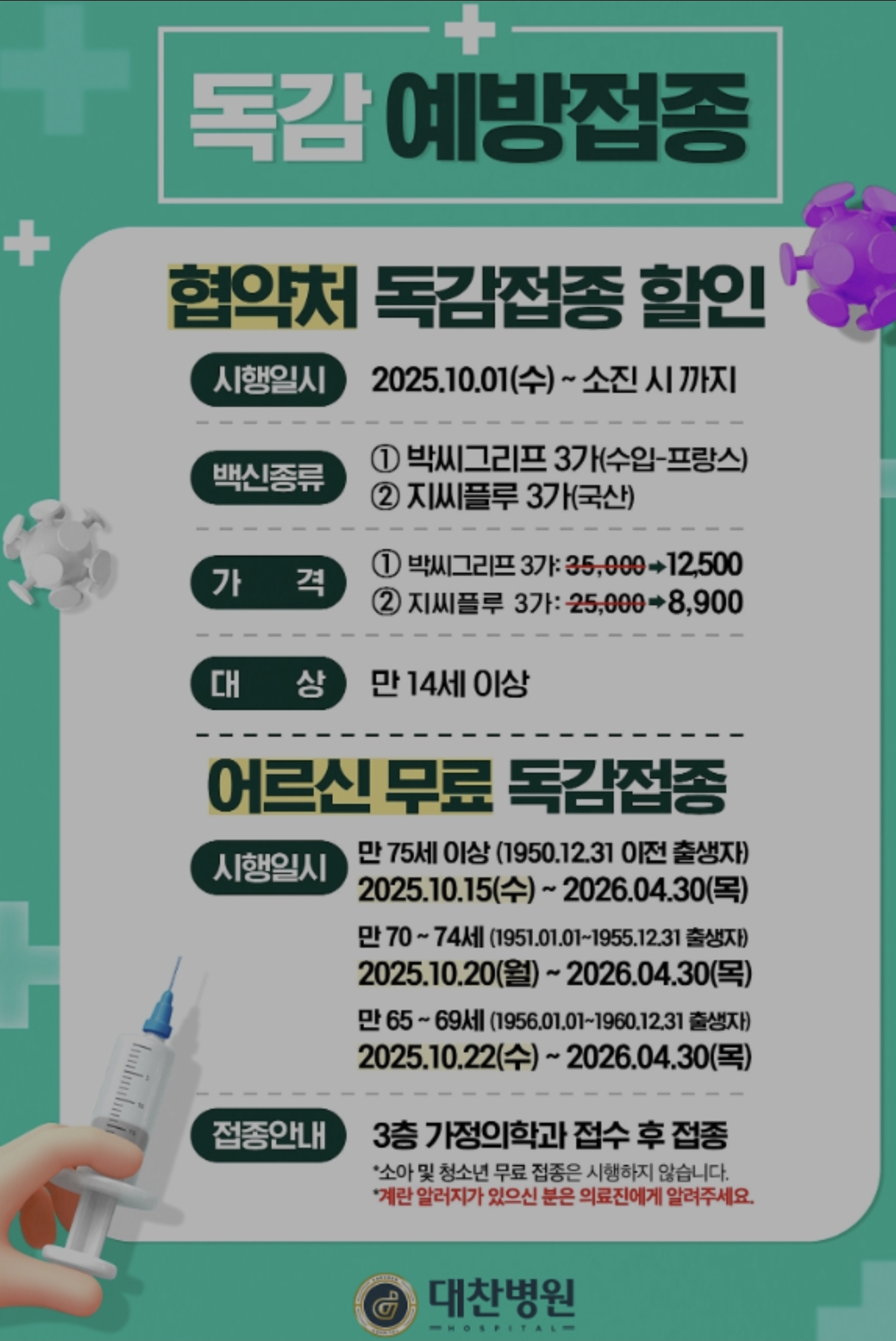 “우리 아이들과 가족 모두가 이번 겨울 독감 걱정 없이 건강하게 보내기 위해, 예방접종 + 좋은 음식 + 기본위생을 꼼꼼하게 챙겨보세요.”
