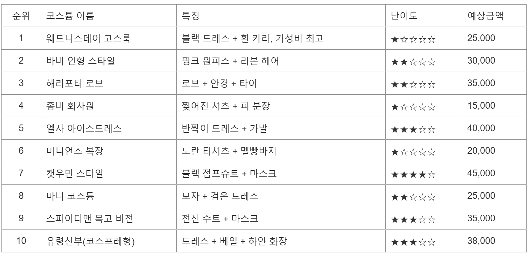 아래는 올해 인기 상승 중인 코스튬 순위예요.